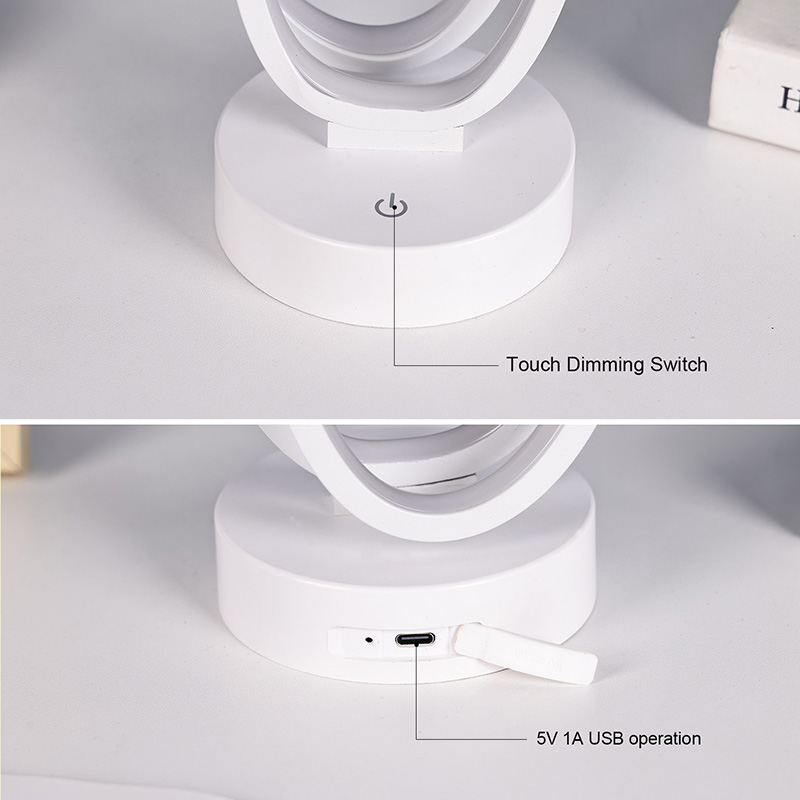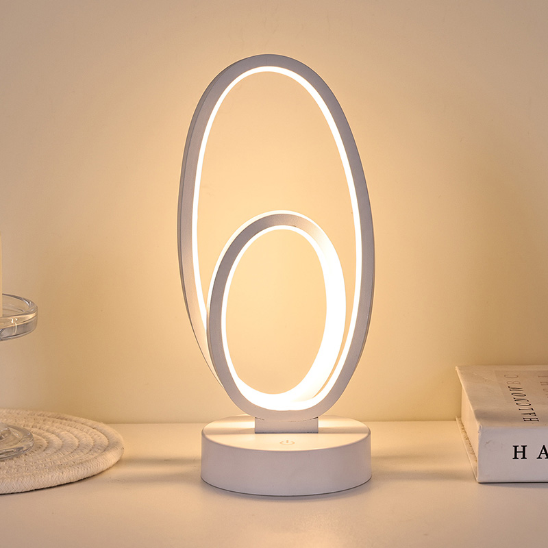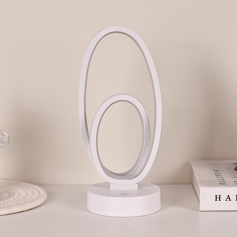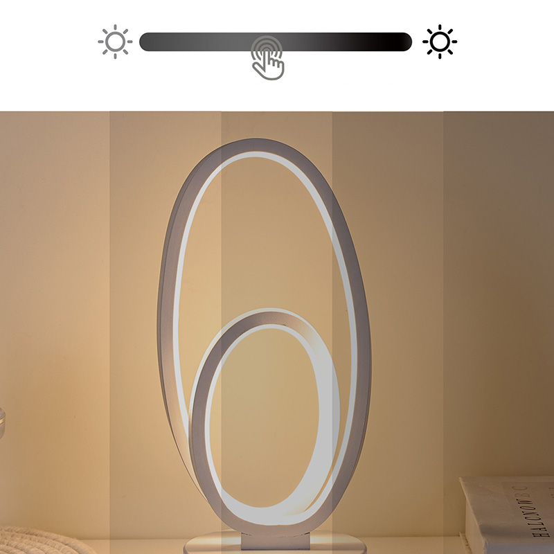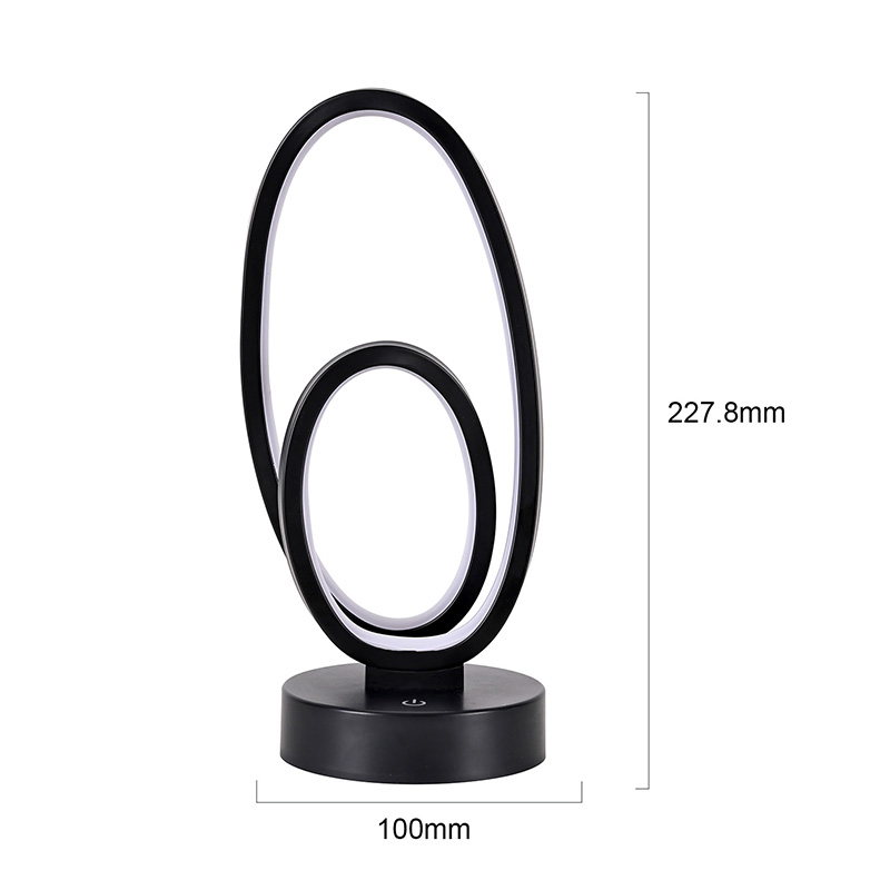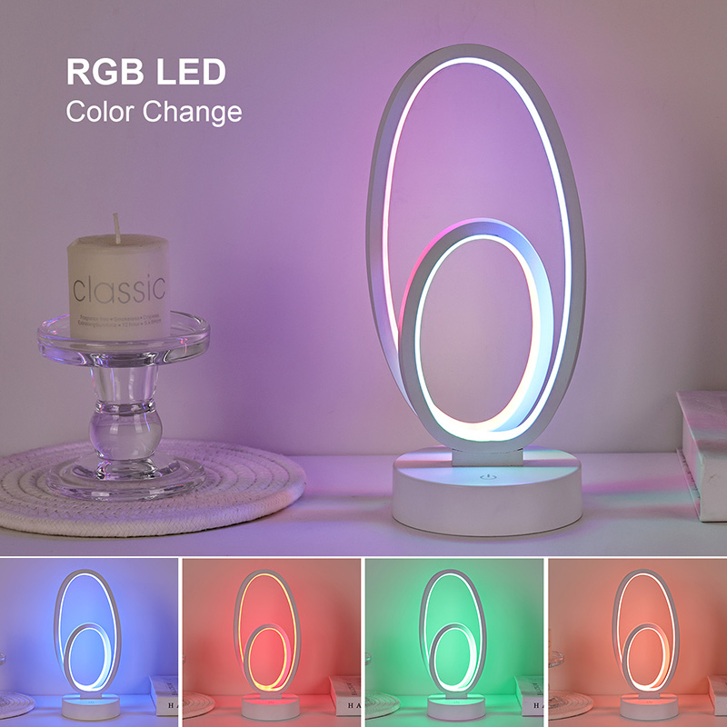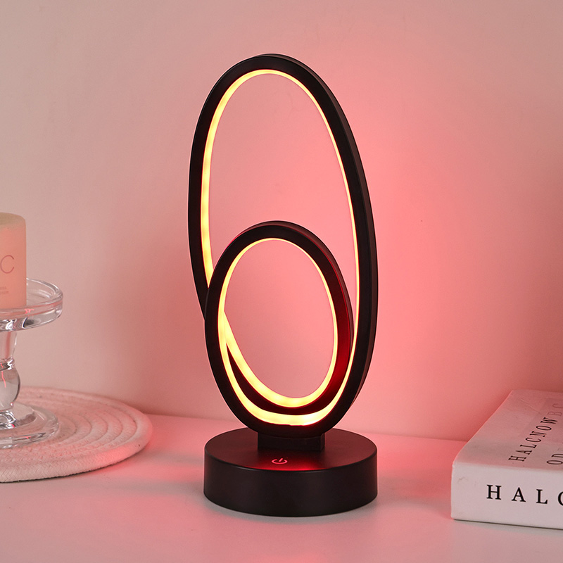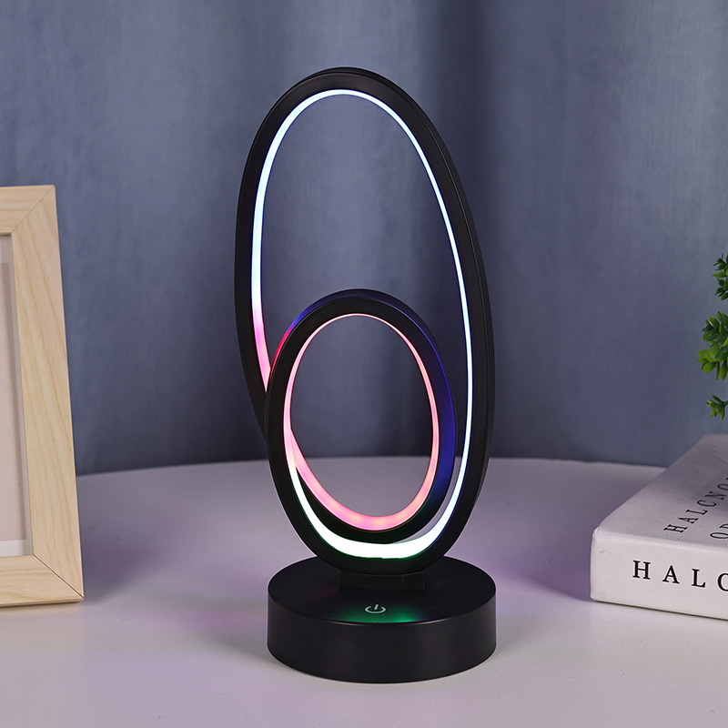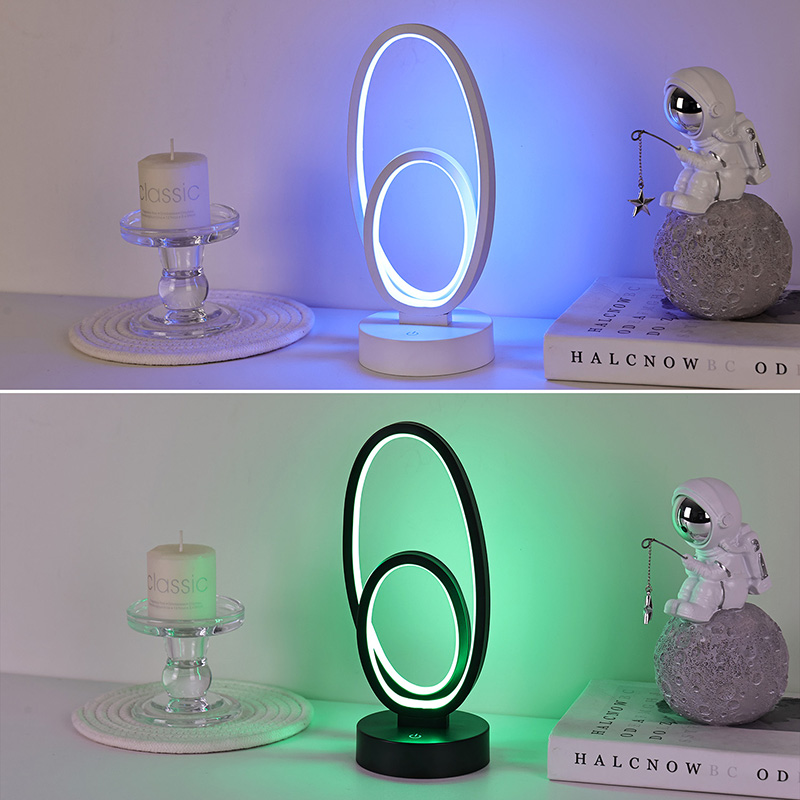 ຂະໜາດ 44*33*H23.5ຊມDouble Circular Ring Shade RGB Desk Lamp ມີການອອກແບບວົງແຫວນຄູ່, ມີຮູບຊົງທີ່ສະຫງ່າງາມທີ່ລະບຸໄວ້ໂດຍສາຍນ້ອຍ. ການປະສົມປະສານຂອງໂລຫະແລະພາດສະຕິກທີ່ມີຄຸນນະພາບສູງ, ມັນປະກອບດ້ວຍໂຄງສ້າງພິເສດແລະການສໍາພັດທີ່ລະອຽດອ່ອນ. ນອກເຫນືອຈາກການເປັນເຄື່ອງມືເຮັດໃຫ້ມີແສງ, ມັນ