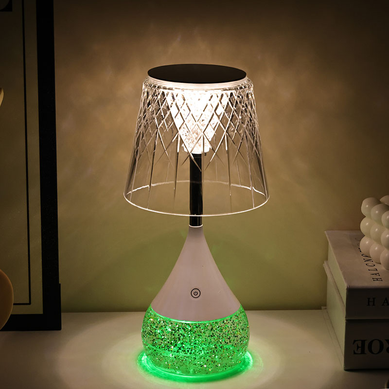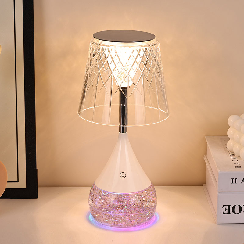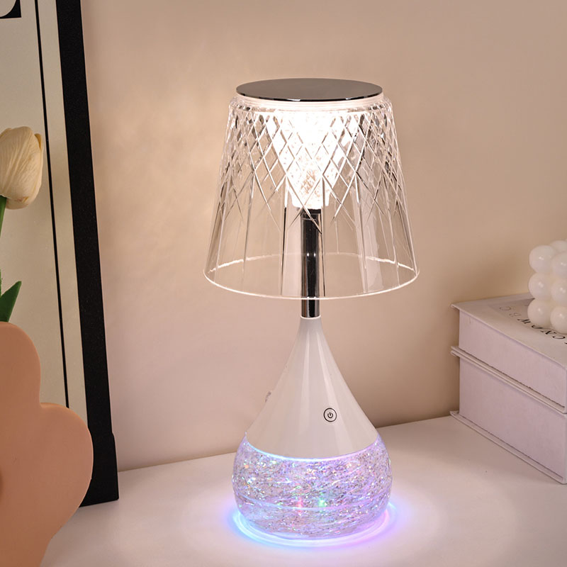 Luxury Cone arte Desk Lamp with Crystal Shade .ການອອກແບບໂຄມໄຟຕັ້ງໂຕະນີ້ແມ່ນເຮັດດ້ວຍແກ້ວກ່ອງພາດສະຕິກ, ໂດຍເນັ້ນໃສ່ການສ້າງແບບໂປ່ງໃສ ແລະຫຼູຫຼາ. ໂຄມໄຟແມ່ນເຮັດດ້ວຍວັດສະດຸ acrylic ໂປ່ງໃສ, ມີການອອກແບບເສັ້ນແລະຝາດ້ານນອກໂປ່ງໃສ. ແສງສະຫວ່າງສາມາດມີສີທີ່ອົບອຸ່ນ, ກ່ອງສີທໍາມະຊາດອົງປະກອບແສງສະຫວ່າງສີຂາວ, ແລະສີຕ່າງໆສາມາດປັບຄວາມເຂັ້ມຂອງແສງໄດ້, ເຊິ່ງຈະດີຫຼາຍ. ດ້ານລຸ່ມແມ່ນປະກອບດ້ວຍຂອງແຫຼວພາຍໃນແກ້ວແກ້ວ, ແລະແສງສະຫວ່າງຂອງແຫຼວສາມາດປະກອບດ້ວຍສີ RGB illusion.