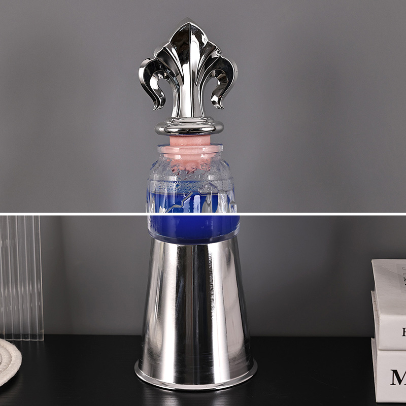 ໂຄມໄຟໂຕະທາວເວີ້ເງົາມີການອອກແບບເປັນຮູບຊົງຂອງຫໍຄອຍແບບຄລາສສິກ, ດ້ວຍການຕົບແຕ່ງດ້ວຍໂລຫະສີດຳທີ່ງົດງາມທີ່ຝັງຢູ່ເທິງສຸດ, ລຽບງ່າຍແຕ່ສະຫງ່າງາມ. ພາຍໃນແກ້ວແກ້ວໂປ່ງໃສ, ມີຂີ້ເຜີ້ງສີຟ້າ