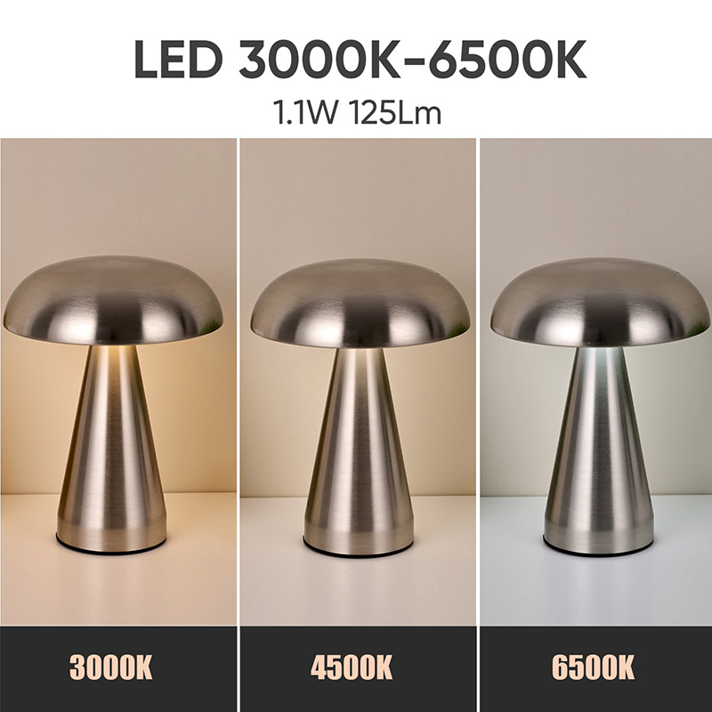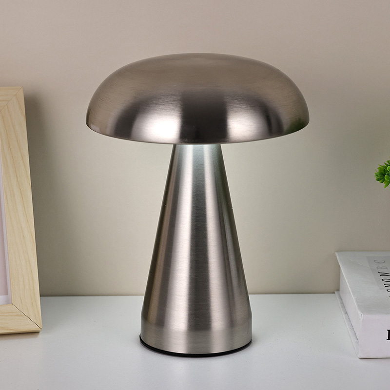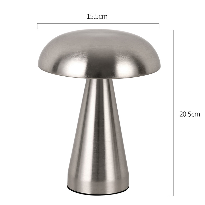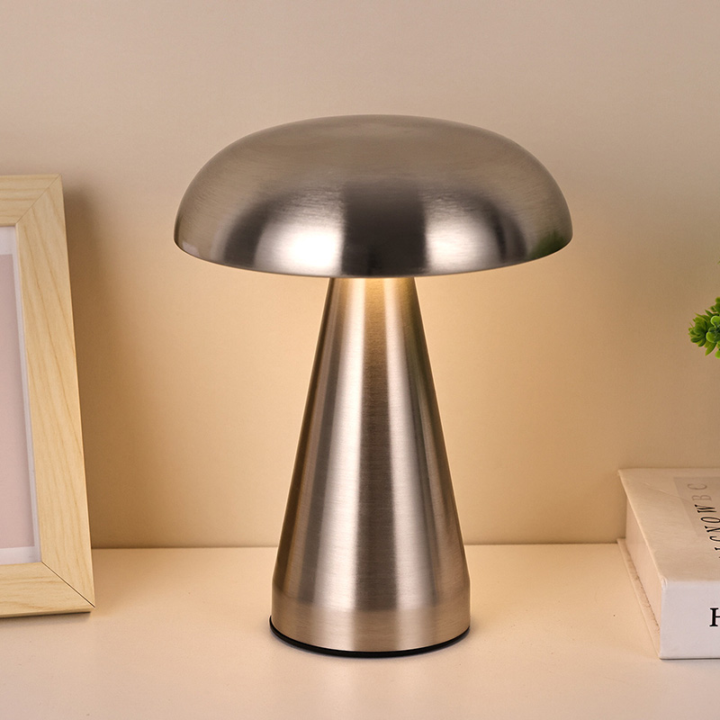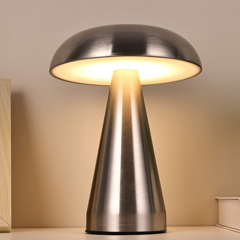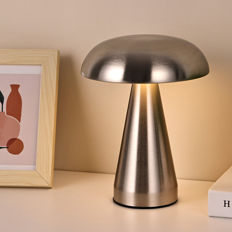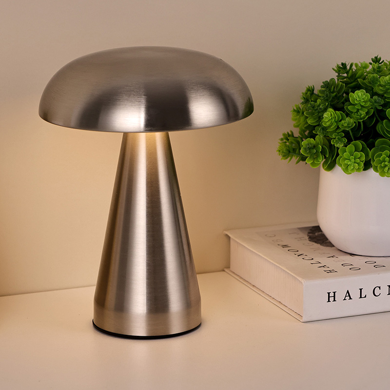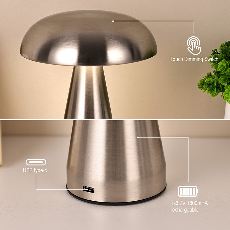 ໂຄມໄຟຕັ້ງໂຕະ LED ໂລຫະທັງໝົດມີຮົ່ມເຫັດມີ usb type-c ສາມາດສາກໄດ້ພາຍໃຕ້ຖານສາມາດສາກແບັດໄດ້ 1800ma ພາຍໃນ